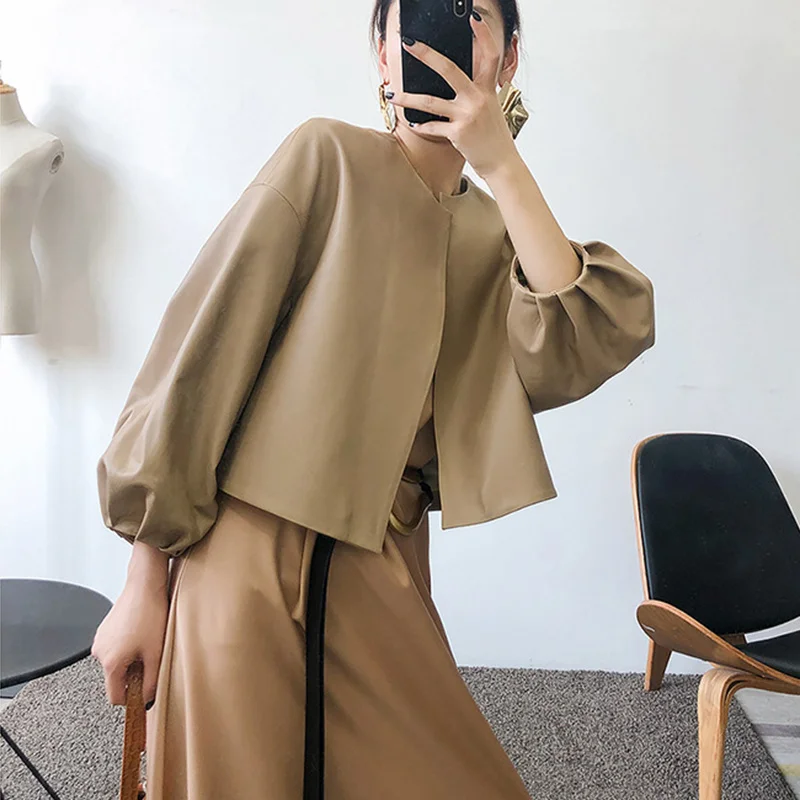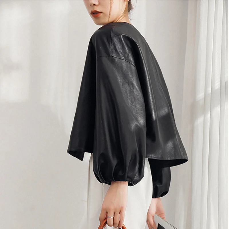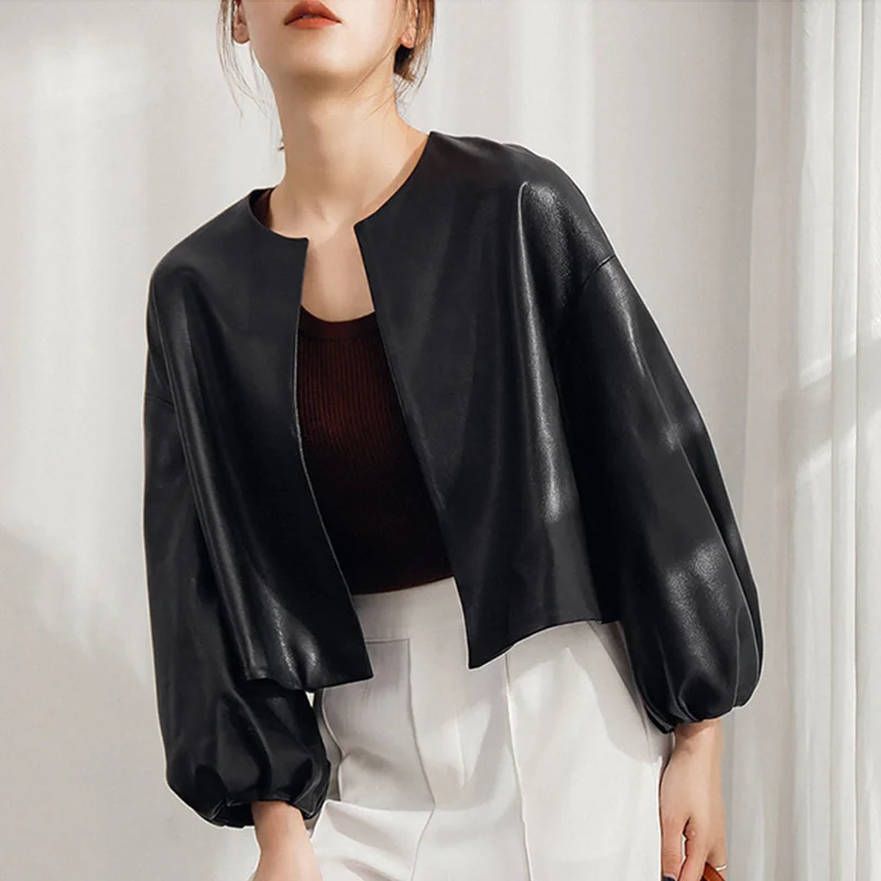 Short Genuine Coat Leather Women's 2023 Spring Korean Loose Casual O-Neck Lantern Sleeve Sheep Leather Jacket Women's Clothing