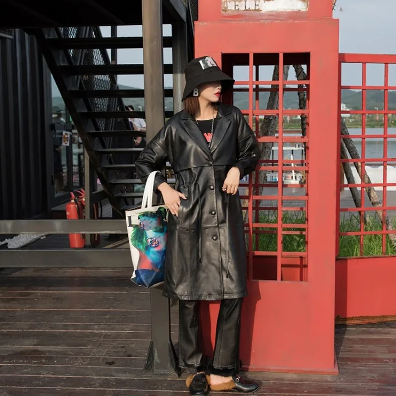 2020 Designer Women Patchwork Sheepskin Genuine Jacket Single Breasted Windbreaker Trench Ladies Real Leather Long Coat