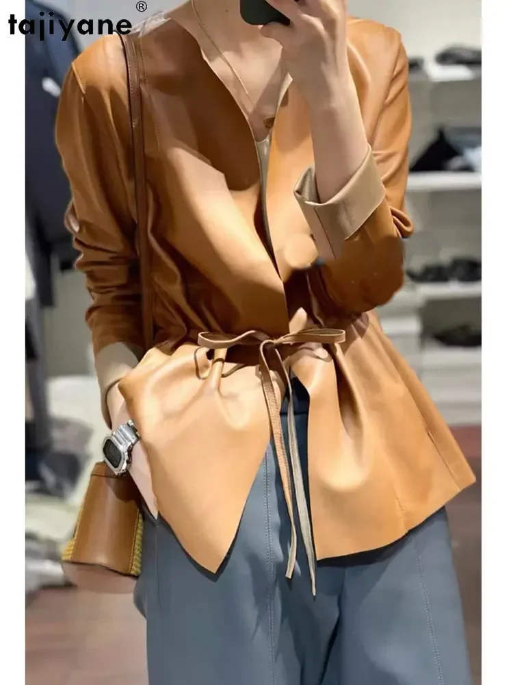 Tajiyane Real Sheepskin Coat Elegant O-neck Leather Jackets for Women 2023 Genuine Leather Jacket Elegant Loose Outwear Belt