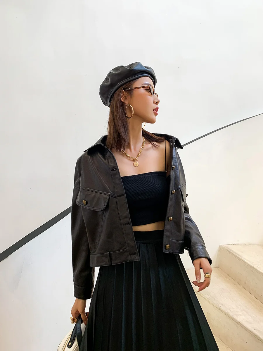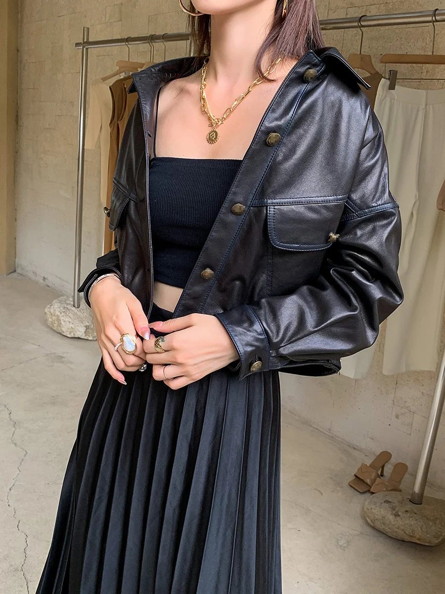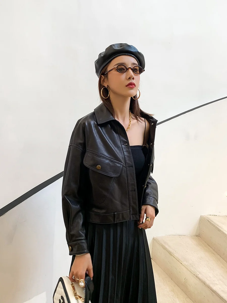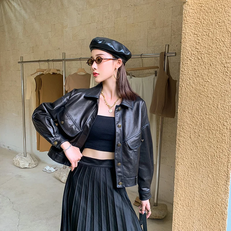 Leather Jacket Women Sheepskin Clothes High-end Fashion Motorcycle Jackets Black Short Women's Coats Casaco De Couro Feminino Sq