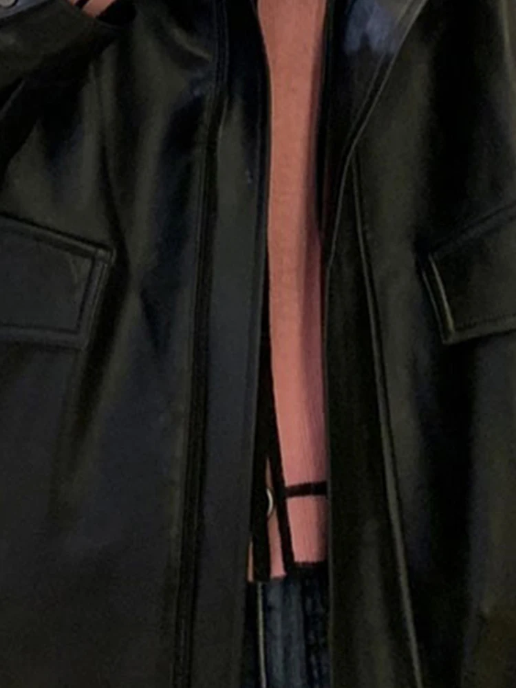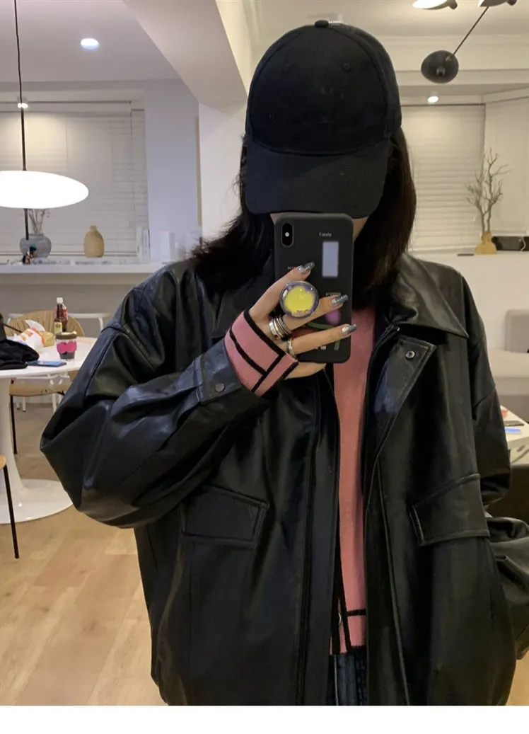2024 Spring Autumn Cool Retro Casual Oversized Black Waterproof Soft Faux Leather Jackets for Women Zipper Elastic Waist