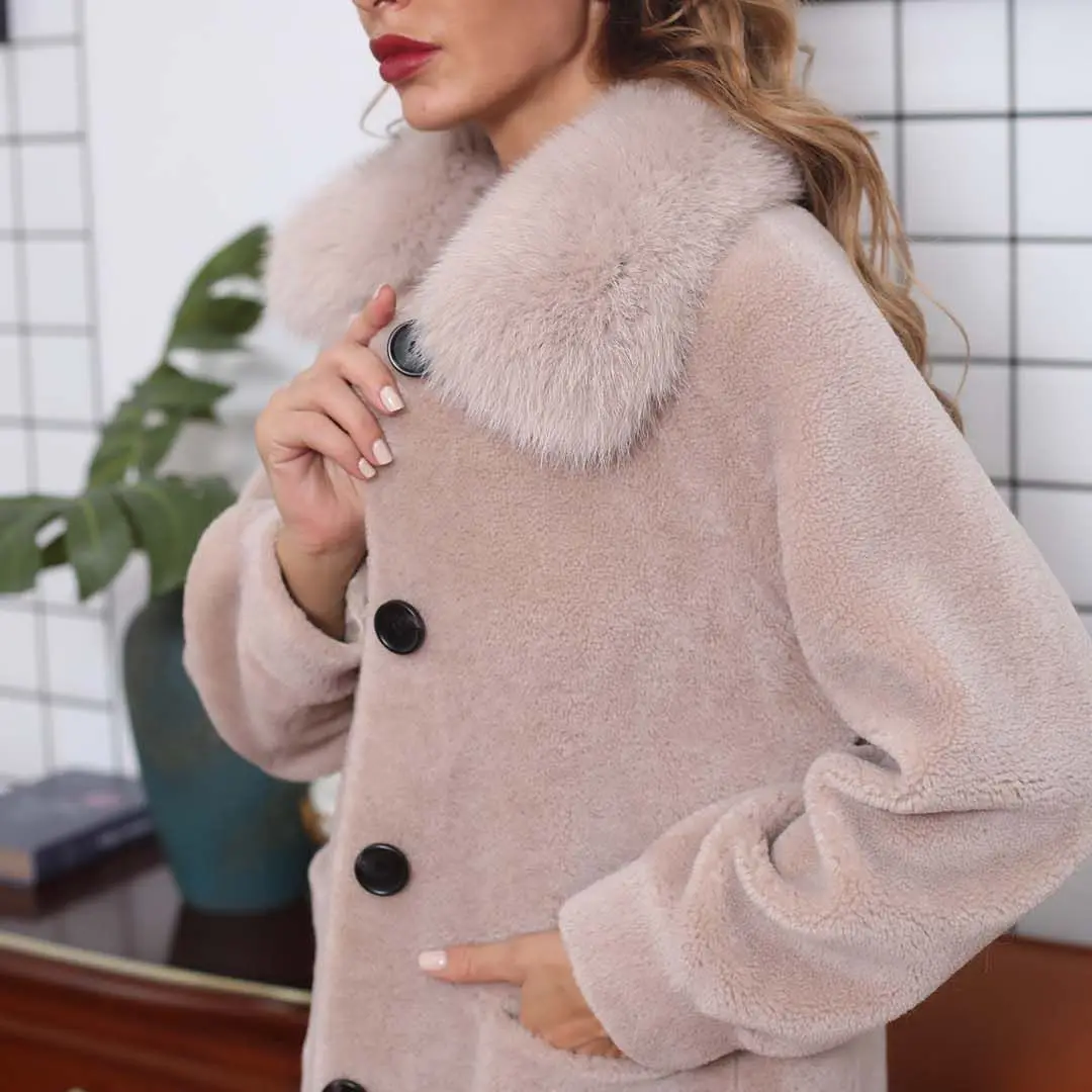Thick Warm Elegant Teddy Coat Small Square Collar Real Sheep Skin Overcoat Winter Shearing Outwear With Vertical Pocket