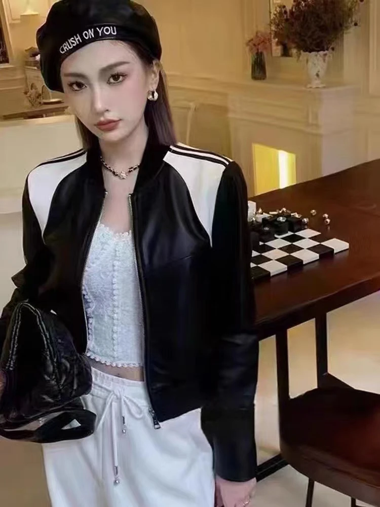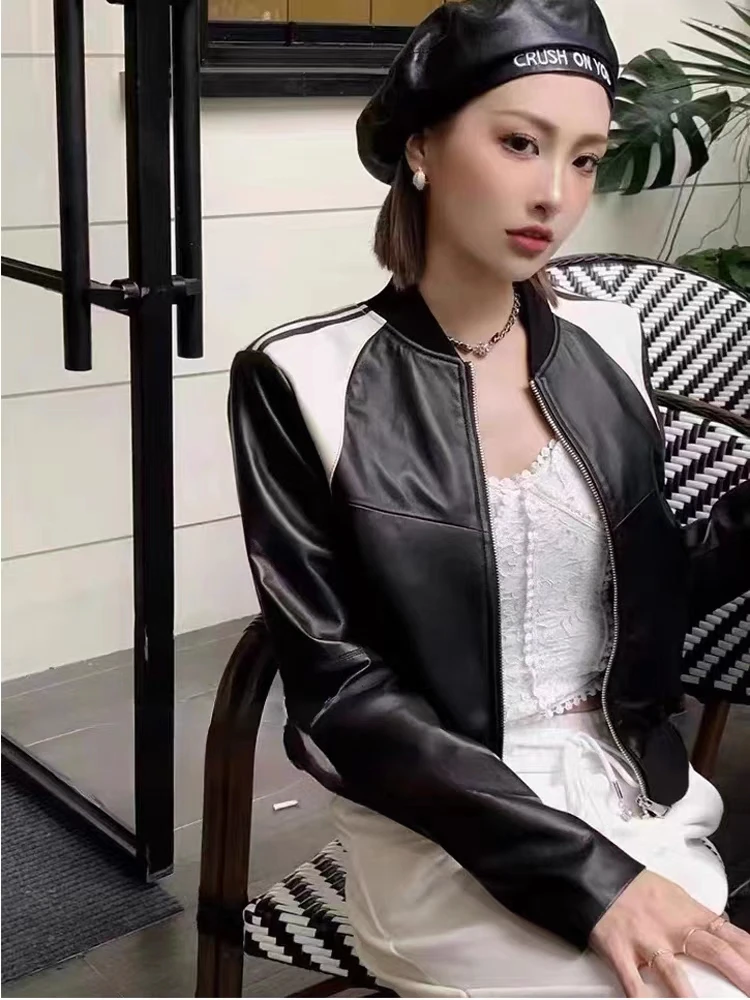 2023 Genuine Women Sheepskin Coat Fashion White Black Splicing Real Leather Jacket Spring Autumn New Outerwear Streetwear