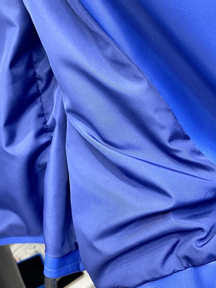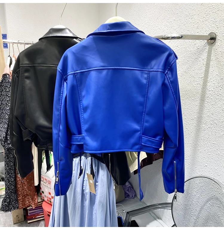 Spring Autumn Short Blue Soft Pu Leather Biker Jacket Women Zipper Long Sleeve Belt Cool Luxury Designer Clothes 2024