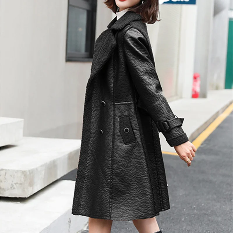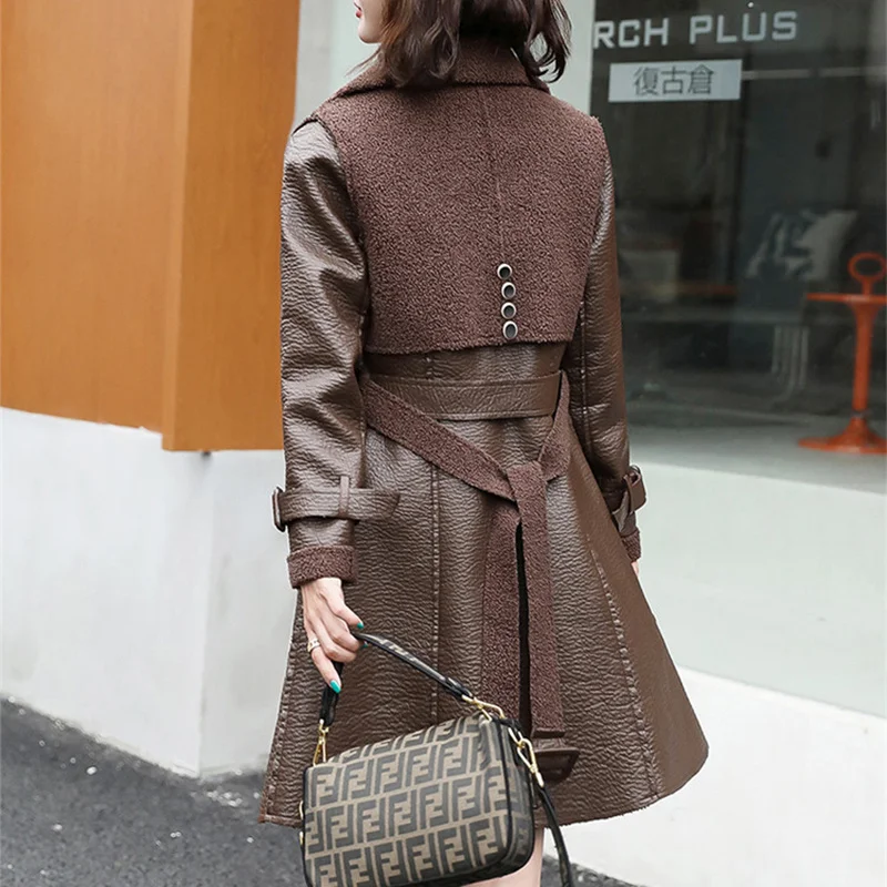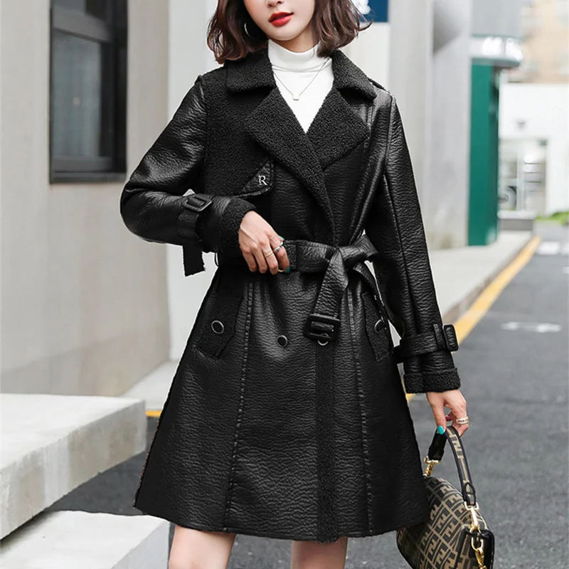 Coats Genuine Winter Leather Women's Medium Long Double Breasted Lapel Belt Sheepskin Leather Fur Stitching Windbreaker Jackets