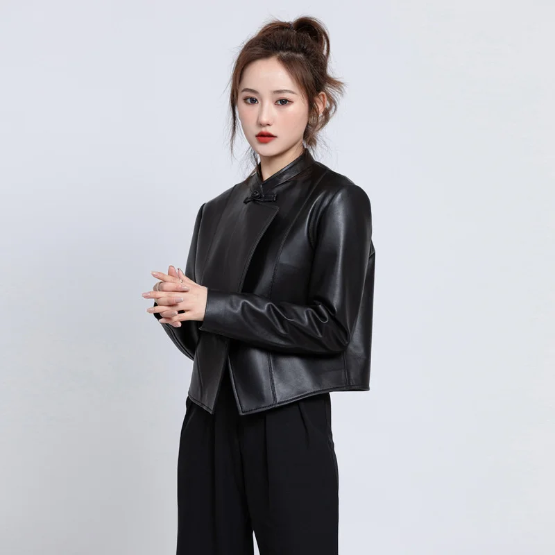 2023 Women's Leather Jacket Spring and Autumn Casual Short Zipper Chinese Style Vintage Buckle Slim Sheepskin Genuine Leather Ja