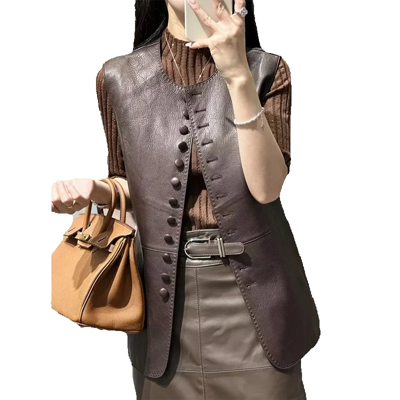 Genuine Leather Vest, Sheep Leather Round Neck, Sleeveless Vest, Temperament, Single Row Leather Buckle Top, Seasonal New