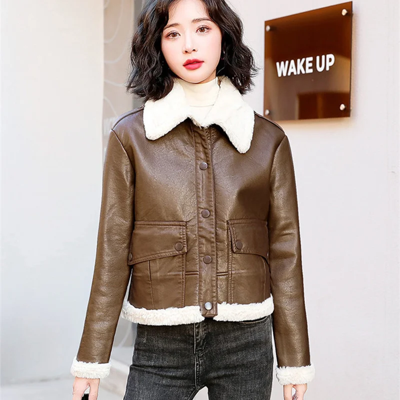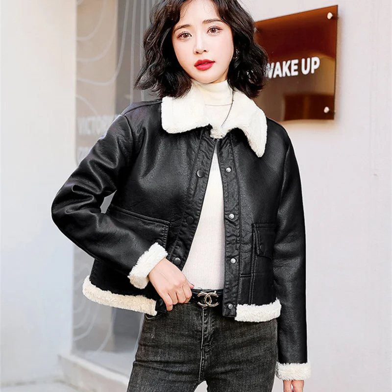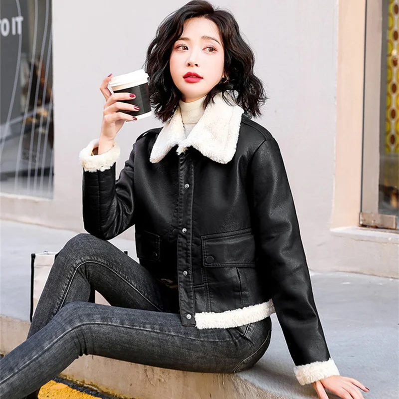 2022 Genuine Leather Women's Winter Coats Casual Pocket Short Single Breasted Biker Sheepskin Leather Fur Stitching Jacket Woman