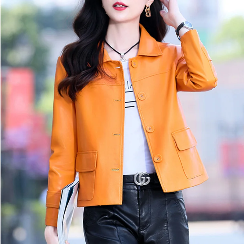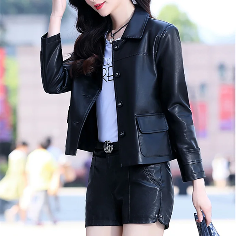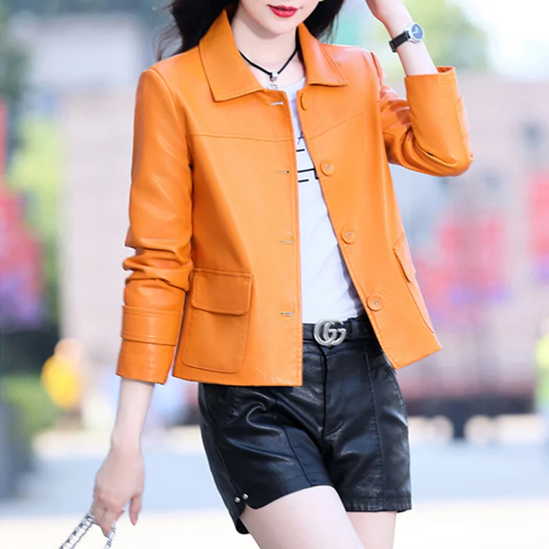 2022 Leather Clothes Women's Short Autumn Casual Loose Single-Breasted Suit Lapel Office Lady Sheepskin Leather Jackets