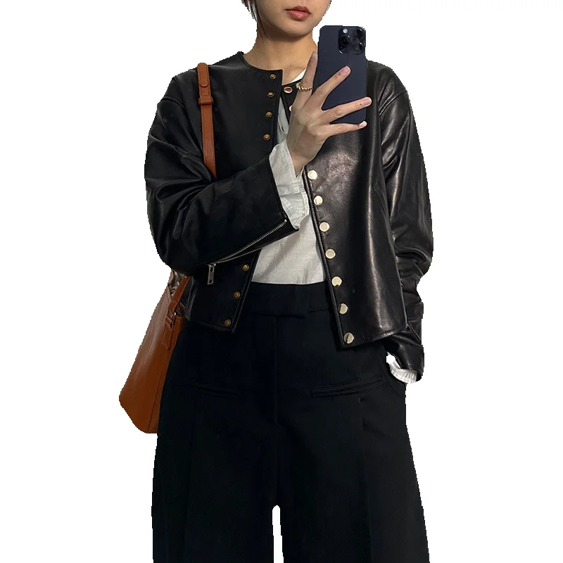 Spring New Round Neck Button Used Sheepskin Genuine Leather Coat Women's Outerwear Trend