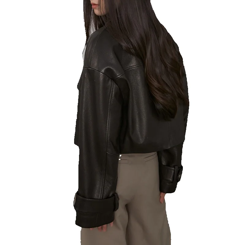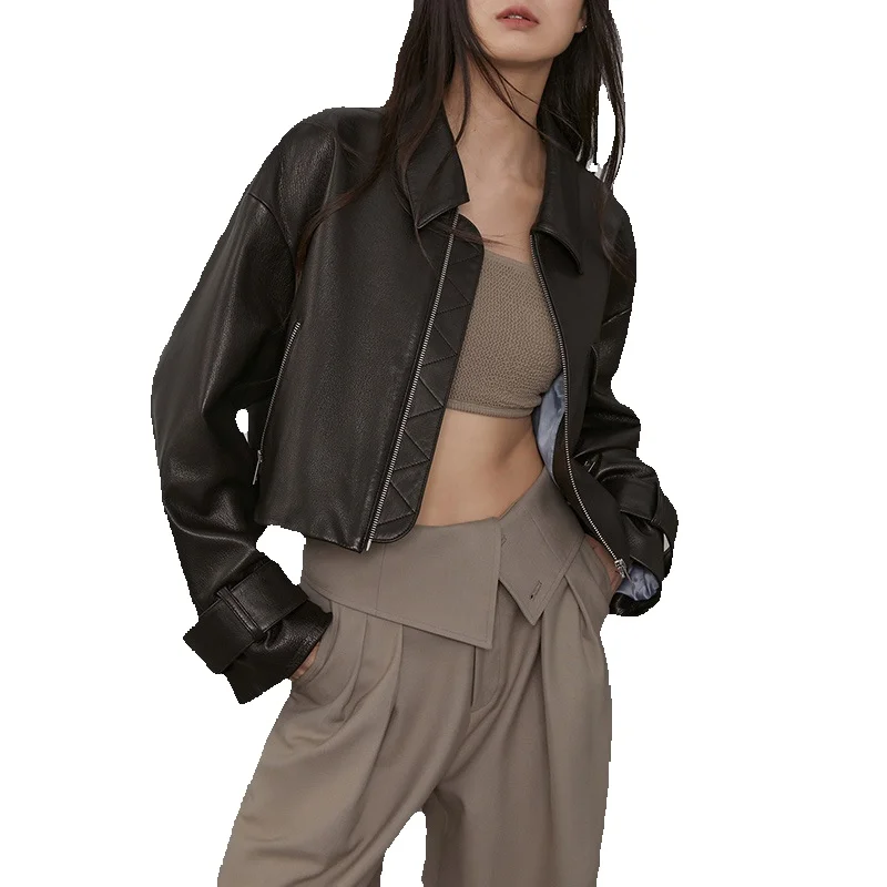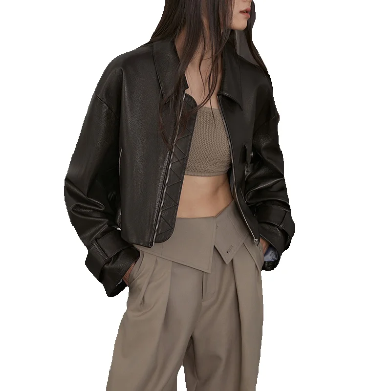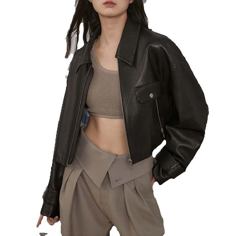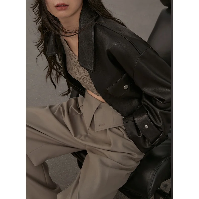 Exquisite Lapel Short Sheepskin Jacket With Loose Fitting Leather Silhouette