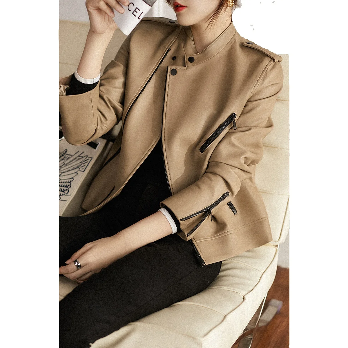 Spring New Genuine Leather Jacket For Women's Short And Minimalist Motorcycle Stand Collar Leather Jacket, Sheepskin Jacket For