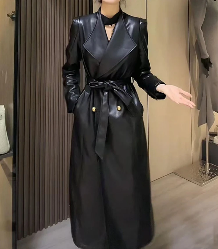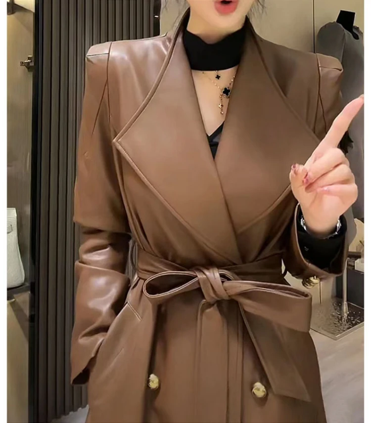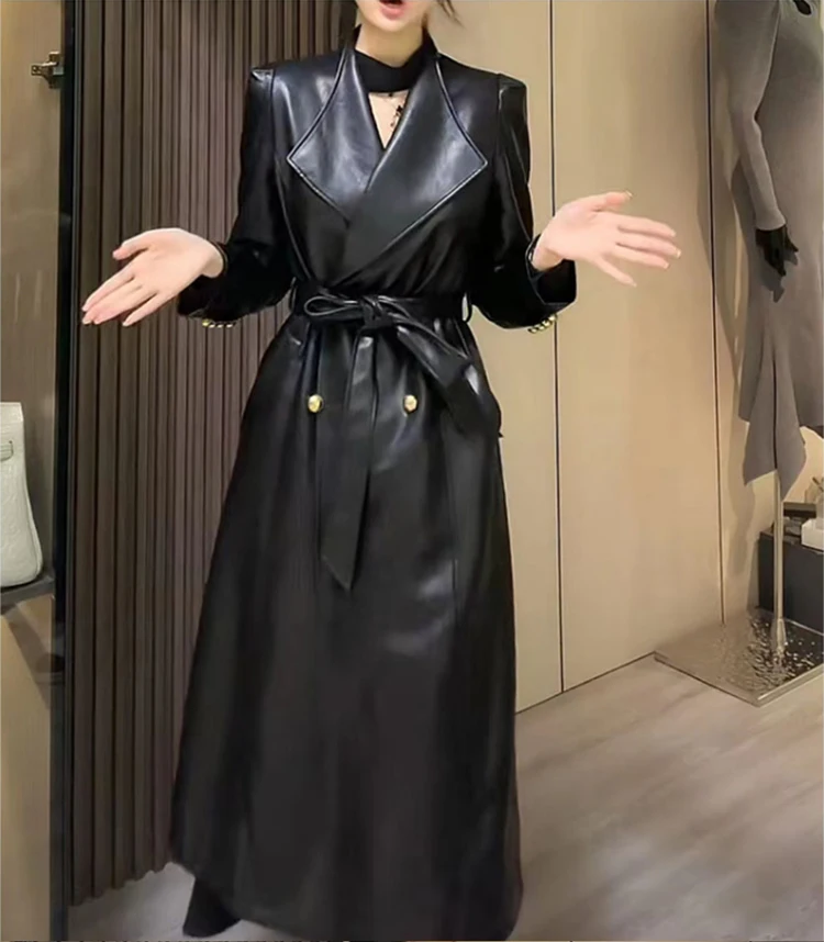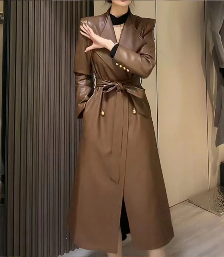 2024 Spring Autumn Luxury Elegant Stylish Chic Long Brown Black Soft Pu Leather Trench Coat for Women Sashes Runway Fashion