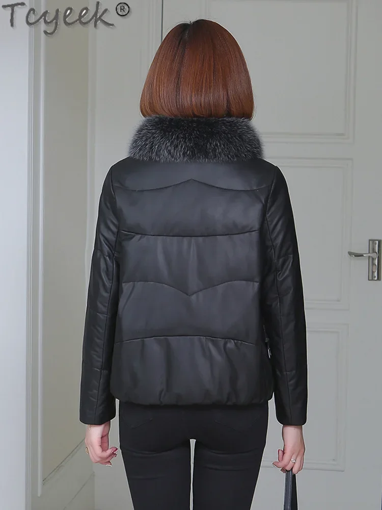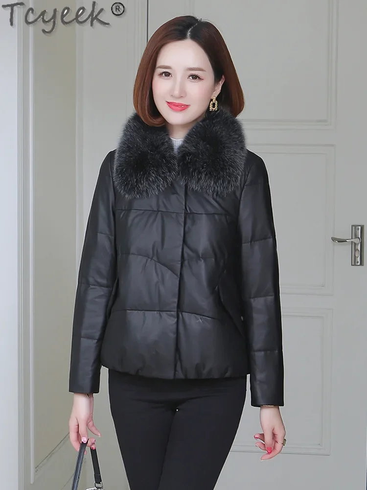 Tcyeek Genuine Leather Down Jacket Women Winter Jackets Warm Fox Fur Collar Elegant Sheepskin Coat for Woman Clothing 2024 Black