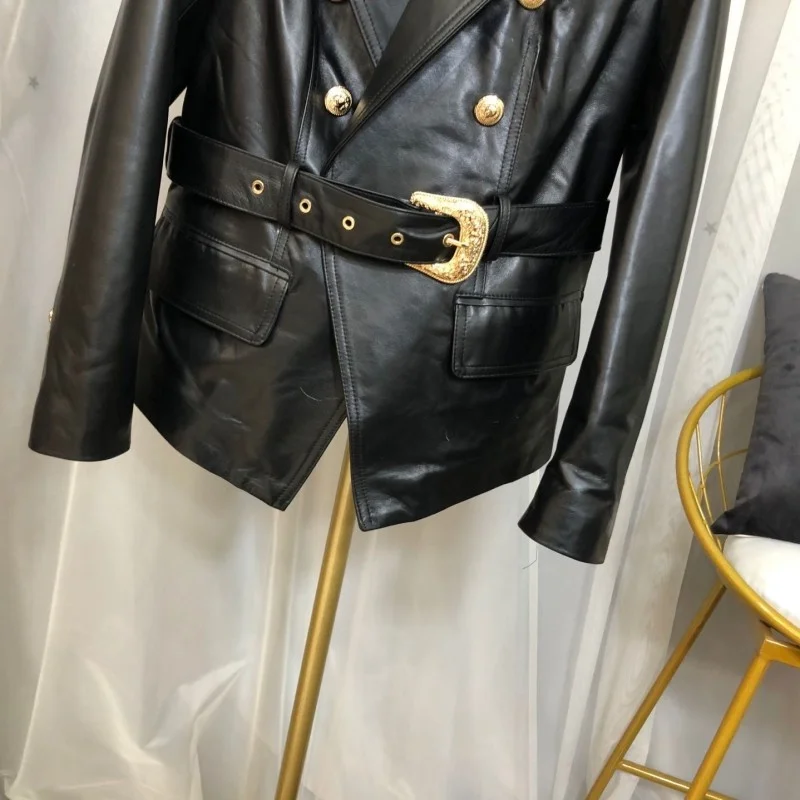 Breasted Double Womens Genuine Leather Jacket Office Lady Turn-Down Collar Black Elegant Coat Autumn Sheepskin Fashion Outerwear