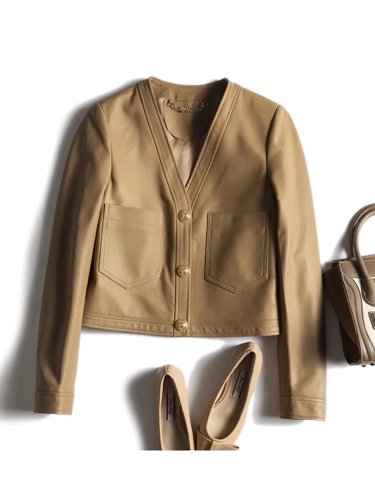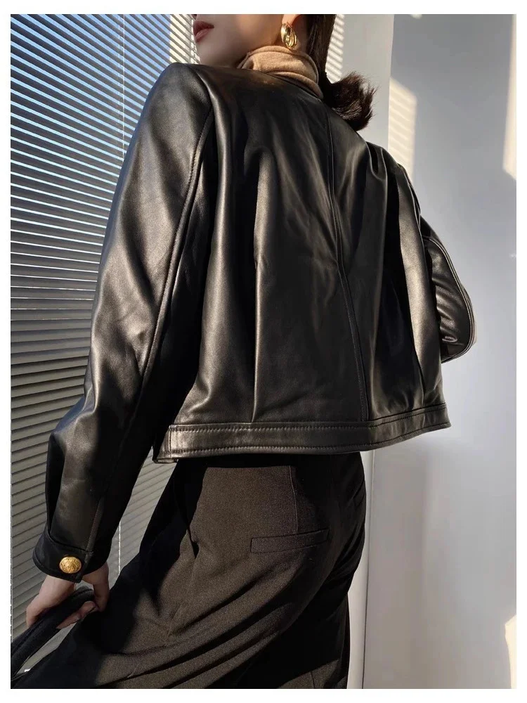 Cropped V-neck Sheepskin Coat for Women Autumn Winter 2024 Trend Metal Single Breasted Genuine Leather Jackets Female